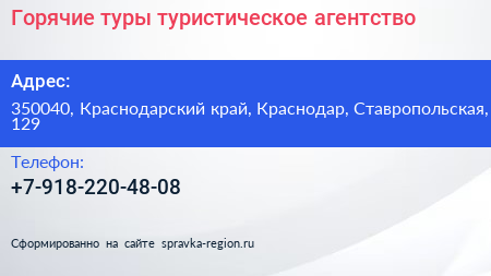Горячие туры, туристическое агентство по адресу 350040, Краснодарский край, Краснодар, Ставропольская, 129 в дальнейшем Организация, размещена в следующих категориях: