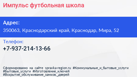 Импульс, футбольная школа по адресу 350063, Краснодарский край, Краснодар, Мира, 52 в дальнейшем Организация, размещена в следующих категориях: