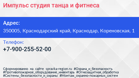 Импульс, студия танца и фитнеса по адресу 350005, Краснодарский край, Краснодар, Кореновская, 1 в дальнейшем Организация, размещена в следующих категориях: