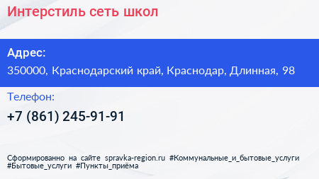 Интерстиль, сеть школ по адресу 350000, Краснодарский край, Краснодар, Длинная, 98 в дальнейшем Организация, размещена в следующих категориях: