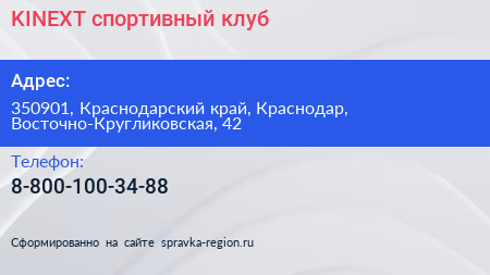 KINEXT, спортивный клуб по адресу 350901, Краснодарский край, Краснодар, Восточно-Кругликовская, 42 в дальнейшем Организация, размещена в следующих категориях: