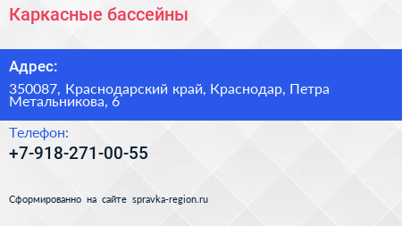 Каркасные бассейны по адресу 350087, Краснодарский край, Краснодар, Петра Метальникова, 6 в дальнейшем Организация, размещена в следующих категориях:
