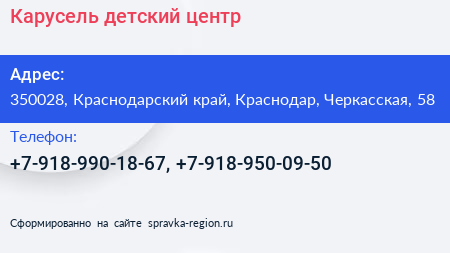 Карусель, детский центр по адресу 350028, Краснодарский край, Краснодар, Черкасская, 58 в дальнейшем Организация, размещена в следующих категориях: