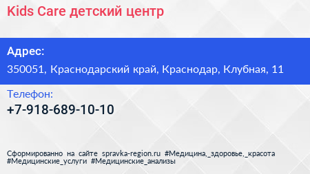 Kids Care, детский центр по адресу 350051, Краснодарский край, Краснодар, Клубная, 11 в дальнейшем Организация, размещена в следующих категориях: