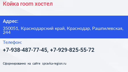 Койка-room, хостел по адресу 350051, Краснодарский край, Краснодар, Рашпилевская, 244 в дальнейшем Организация, размещена в следующих категориях: