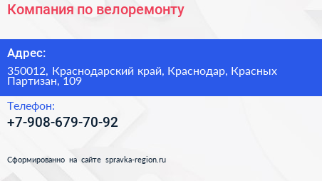 Компания по велоремонту по адресу 350012, Краснодарский край, Краснодар, Красных Партизан, 109 в дальнейшем Организация, размещена в следующих категориях: