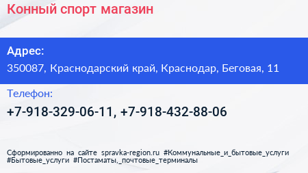 Конный спорт, магазин по адресу 350087, Краснодарский край, Краснодар, Беговая, 11 в дальнейшем Организация, размещена в следующих категориях: