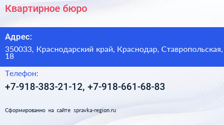 Квартирное бюро по адресу 350033, Краснодарский край, Краснодар, Ставропольская, 18 в дальнейшем Организация, размещена в следующих категориях: