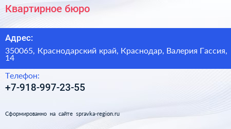 Квартирное бюро по адресу 350065, Краснодарский край, Краснодар, Валерия Гассия, 14 в дальнейшем Организация, размещена в следующих категориях: