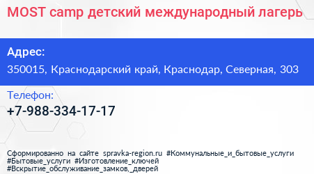 MOST camp, детский международный лагерь по адресу 350015, Краснодарский край, Краснодар, Северная, 303 в дальнейшем Организация, размещена в следующих категориях: