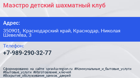 Маэстро, детский шахматный клуб по адресу 350901, Краснодарский край, Краснодар, Николая Шевелёва, 3 в дальнейшем Организация, размещена в следующих категориях: