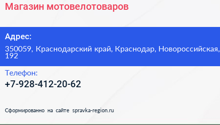 Магазин мотовелотоваров по адресу 350059, Краснодарский край, Краснодар, Новороссийская, 192 в дальнейшем Организация, размещена в следующих категориях: