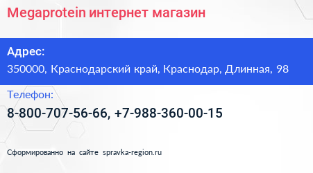 Megaprotein, интернет-магазин по адресу 350000, Краснодарский край, Краснодар, Длинная, 98 в дальнейшем Организация, размещена в следующих категориях: