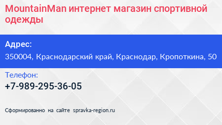 MountainMan, интернет-магазин спортивной одежды по адресу 350004, Краснодарский край, Краснодар, Кропоткина, 50 в дальнейшем Организация, размещена в следующих категориях: