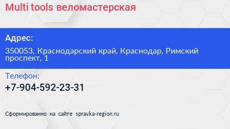 Multi tools, веломастерская по адресу 350053, Краснодарский край, Краснодар, Римский проспект, 1 в дальнейшем Организация, размещена в следующих категориях: