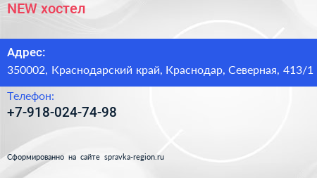 NEW, хостел по адресу 350002, Краснодарский край, Краснодар, Северная, 413/1 в дальнейшем Организация, размещена в следующих категориях: