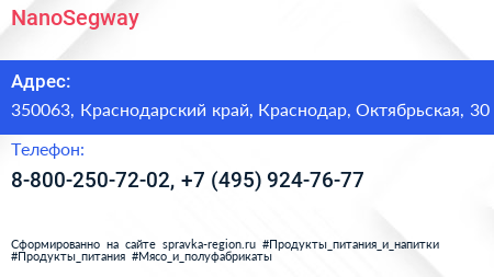 NanoSegway по адресу 350063, Краснодарский край, Краснодар, Октябрьская, 30 в дальнейшем Организация, размещена в следующих категориях:
