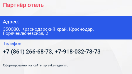 Для связи с организацией воспользуйтесь номером телефона: +7 (861) 266-68-73, +7-918-032-78-73. Ежедневно с 00:00 до 24:00, вы можете обратиться в эту организацию.