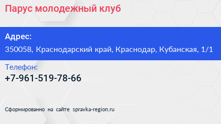 Парус, молодежный клуб по адресу 350058, Краснодарский край, Краснодар, Кубанская, 1/1 в дальнейшем Организация, размещена в следующих категориях: