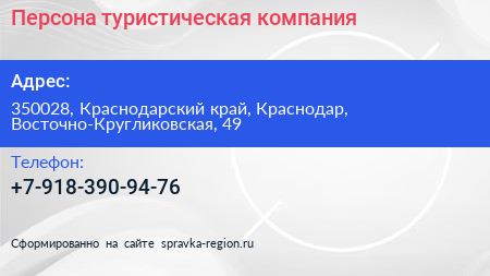 Персона, туристическая компания по адресу 350028, Краснодарский край, Краснодар, Восточно-Кругликовская, 49 в дальнейшем Организация, размещена в следующих категориях: