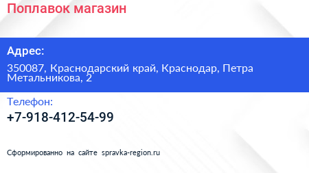 Поплавок, магазин по адресу 350087, Краснодарский край, Краснодар, Петра Метальникова, 2 в дальнейшем Организация, размещена в следующих категориях: