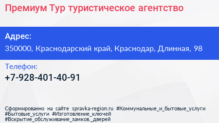 Премиум Тур, туристическое агентство по адресу 350000, Краснодарский край, Краснодар, Длинная, 98 в дальнейшем Организация, размещена в следующих категориях:
