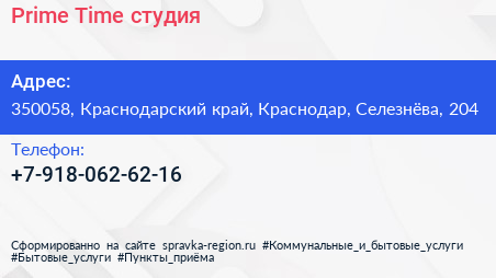 Prime Time, студия по адресу 350058, Краснодарский край, Краснодар, Селезнёва, 204 в дальнейшем Организация, размещена в следующих категориях: