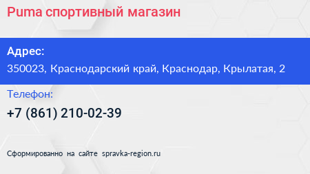 Puma, спортивный магазин по адресу 350023, Краснодарский край, Краснодар, Крылатая, 2 в дальнейшем Организация, размещена в следующих категориях: