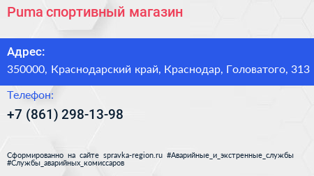 Puma, спортивный магазин по адресу 350000, Краснодарский край, Краснодар, Головатого, 313 в дальнейшем Организация, размещена в следующих категориях: