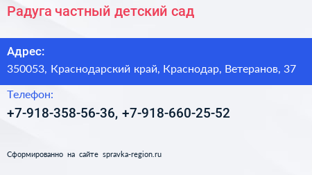 Радуга, частный детский сад по адресу 350053, Краснодарский край, Краснодар, Ветеранов, 37 в дальнейшем Организация, размещена в следующих категориях: