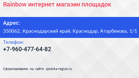 Rainbow, интернет-магазин площадок по адресу 350062, Краснодарский край, Краснодар, Атарбекова, 1/1 в дальнейшем Организация, размещена в следующих категориях: