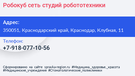 Робокуб, сеть студий робототехники по адресу 350051, Краснодарский край, Краснодар, Клубная, 11 в дальнейшем Организация, размещена в следующих категориях: