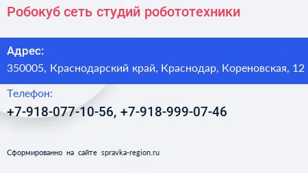 Робокуб, сеть студий робототехники по адресу 350005, Краснодарский край, Краснодар, Кореновская, 12 в дальнейшем Организация, размещена в следующих категориях: