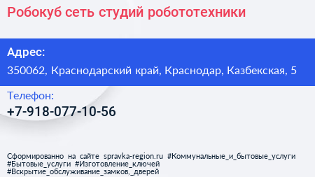 Робокуб, сеть студий робототехники по адресу 350062, Краснодарский край, Краснодар, Казбекская, 5 в дальнейшем Организация, размещена в следующих категориях:
