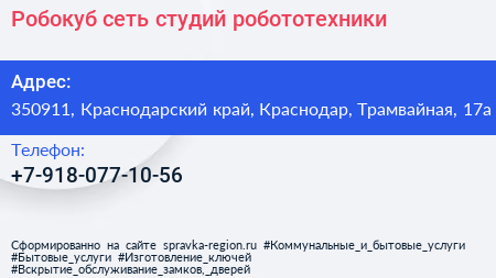 Робокуб, сеть студий робототехники по адресу 350911, Краснодарский край, Краснодар, Трамвайная, 17а в дальнейшем Организация, размещена в следующих категориях:
