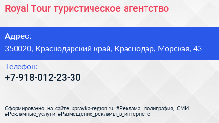 Royal-Tour, туристическое агентство по адресу 350020, Краснодарский край, Краснодар, Морская, 43 в дальнейшем Организация, размещена в следующих категориях:
