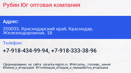 Рубин Юг, оптовая компания по адресу 350033, Краснодарский край, Краснодар, Железнодорожная, 18 в дальнейшем Организация, размещена в следующих категориях: