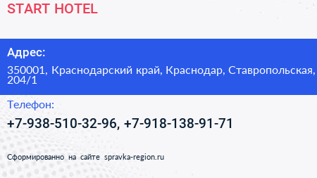 START HOTEL по адресу 350001, Краснодарский край, Краснодар, Ставропольская, 204/1 в дальнейшем Организация, размещена в следующих категориях: