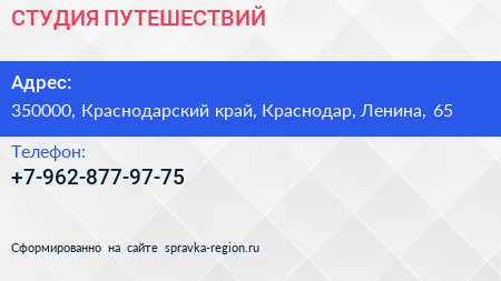 СТУДИЯ ПУТЕШЕСТВИЙ по адресу 350000, Краснодарский край, Краснодар, Ленина, 65 в дальнейшем Организация, размещена в следующих категориях: