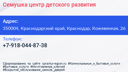 Семушка, центр детского развития по адресу 350004, Краснодарский край, Краснодар, Кожевенная, 26 в дальнейшем Организация, размещена в следующих категориях: