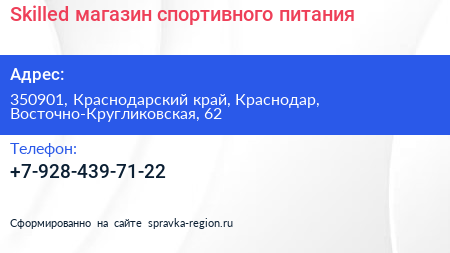 Skilled, магазин спортивного питания по адресу 350901, Краснодарский край, Краснодар, Восточно-Кругликовская, 62 в дальнейшем Организация, размещена в следующих категориях: