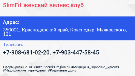 SlimFit, женский велнес-клуб по адресу 350001, Краснодарский край, Краснодар, Маяковского, 121 в дальнейшем Организация, размещена в следующих категориях: