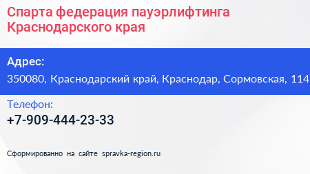 Спарта, федерация пауэрлифтинга Краснодарского края по адресу 350080, Краснодарский край, Краснодар, Сормовская, 114 в дальнейшем Организация, размещена в следующих категориях: