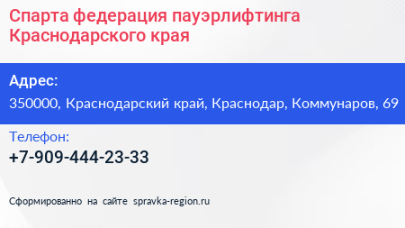 Спарта, федерация пауэрлифтинга Краснодарского края по адресу 350000, Краснодарский край, Краснодар, Коммунаров, 69 в дальнейшем Организация, размещена в следующих категориях: