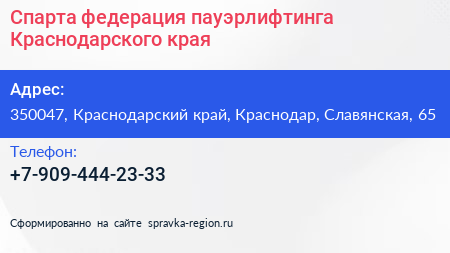 Спарта, федерация пауэрлифтинга Краснодарского края по адресу 350047, Краснодарский край, Краснодар, Славянская, 65 в дальнейшем Организация, размещена в следующих категориях: