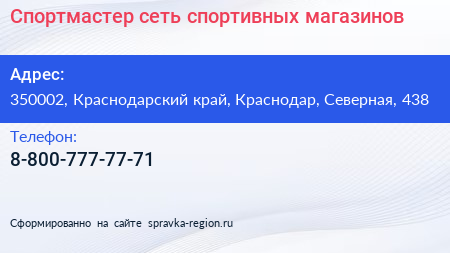 Спортмастер, сеть спортивных магазинов по адресу 350002, Краснодарский край, Краснодар, Северная, 438 в дальнейшем Организация, размещена в следующих категориях: