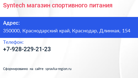 Syntech, магазин спортивного питания по адресу 350000, Краснодарский край, Краснодар, Длинная, 154 в дальнейшем Организация, размещена в следующих категориях: