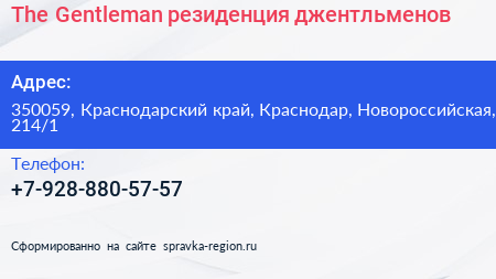 The Gentleman, резиденция джентльменов по адресу 350059, Краснодарский край, Краснодар, Новороссийская, 214/1 в дальнейшем Организация, размещена в следующих категориях: