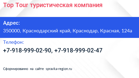 Top Tour, туристическая компания по адресу 350000, Краснодарский край, Краснодар, Красная, 124а в дальнейшем Организация, размещена в следующих категориях: