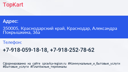 TopKart по адресу 350005, Краснодарский край, Краснодар, Александра Покрышкина, 36а в дальнейшем Организация, размещена в следующих категориях: